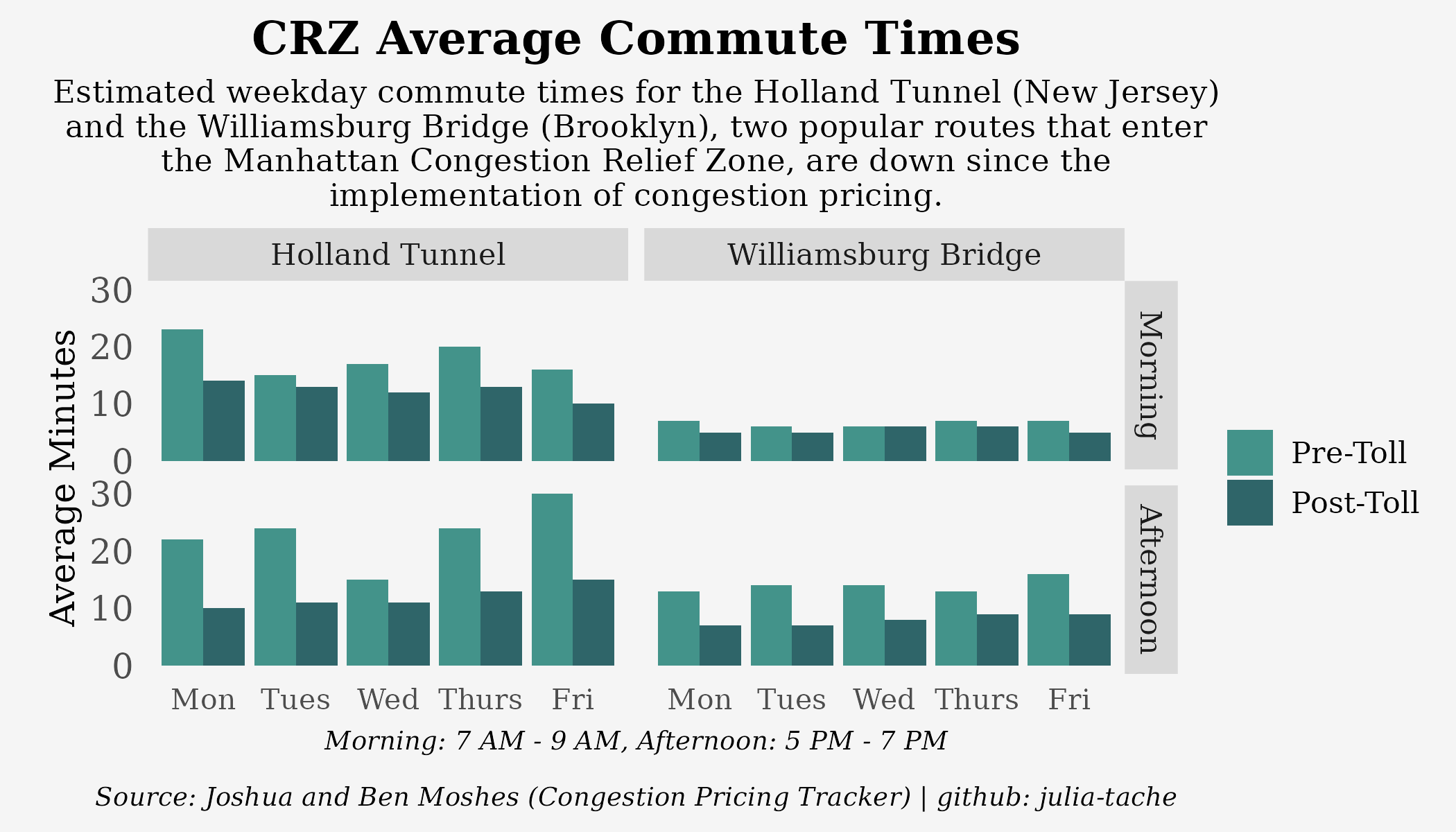 Average commute times on the Holland Tunnel on Monday mornings and Friday afternoons (calculated by averaging commute times between 7:00 AM and 9:00 AM and 5:00 PM and 7:00 PM) were especially high pre-toll: 23 minutes and 30 minutes. After congestion pricing went into effect, those times have now been cut to 14 minutes and 15 minutes. Afternoon commute times on the Williamsburg Bridge have been slashed by almost half on all days.