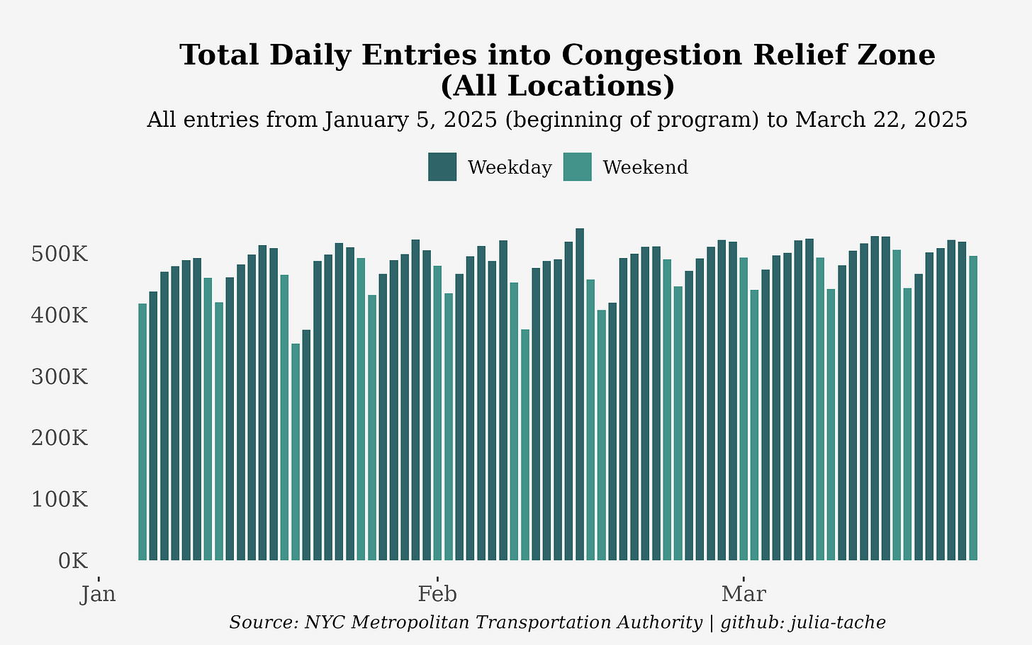 Meanwhile, motorcycle entries have increased. As shown on MTA’s very useful dashboard, the weekday averages for motorcyclists have increased from about 1,490 (from January 6 to January 10) to 1,882 (from March 17 to March 21), or 26.3%. Delivery companies and fiscally-minded motorists taking advantage of warmer weather may be opting to use bikes more frequently. Taxis and rideshares had a weekday average increase of 12.9% from the first week of the program compared to the week of March 17th, and have also increased in presence on weekends. On Saturday, March 15th, there were almost 200,000 taxis and rideshare crossings, the highest level that week.