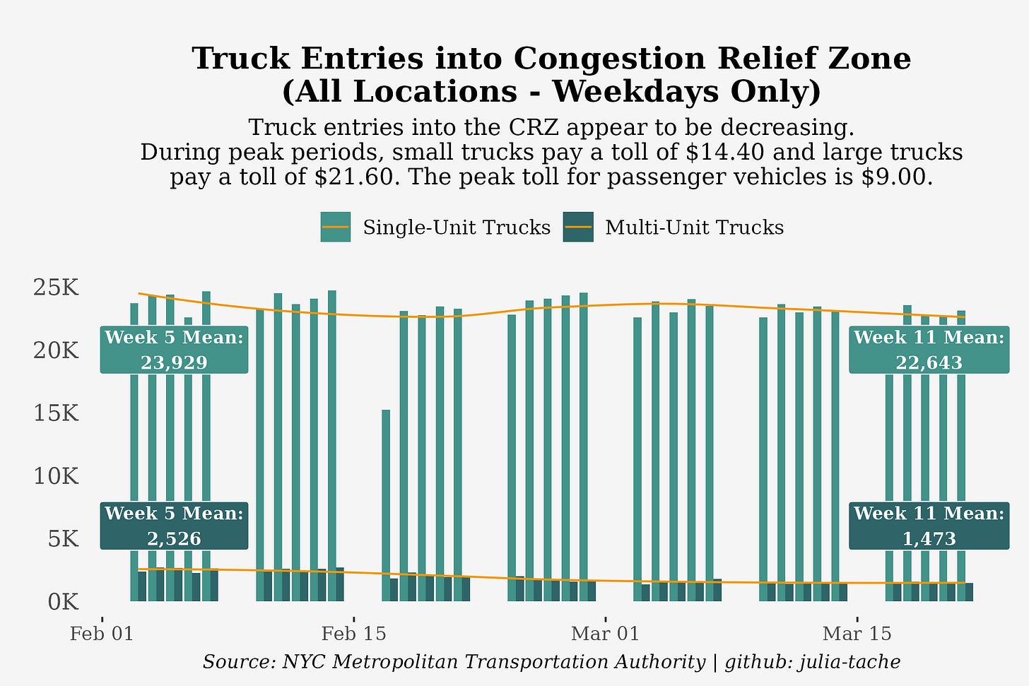 While aggregate vehicle entries have remained relatively consistent over the last few months, certain kinds of vehicles have been entering the zone less over time. There was a reduction of entries on weekdays of small trucks by 5.4% and of large, multi-unit trucks by 41.7% from week 5 to week 11 of the program. Distribution-focused companies may be adjusting to pricing by opting for smaller vehicles for “last mile” deliveries and optimizing routes to avoid higher fees. There could be other factors at play, such as reduced demand for consumer goods amid an uneasy economic outlook. While the effects of reductions in truck volume can only be speculated at this point, less large vehicles on the road could be contributing to the reduction in traffic times.