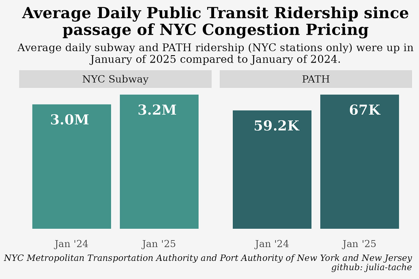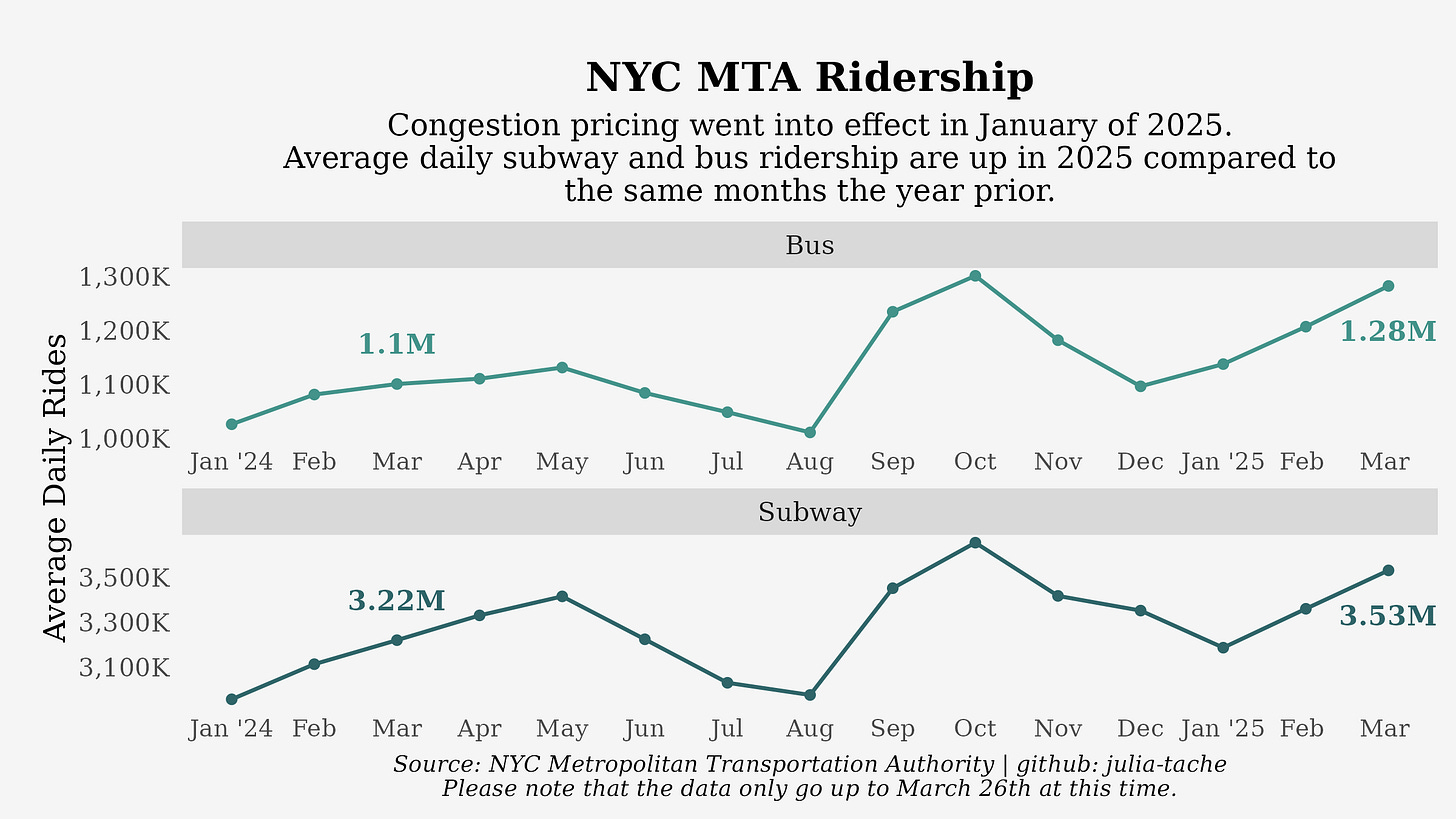 Other transit lines are also seeing increased uptake. The PATH train, which travels from Essex and Hudson Counties in New Jersey to midtown and downtown Manhattan (and a transit system I am very fond of), saw a 13.3% increase in January riders in 2025 at New York City stations from the year prior.