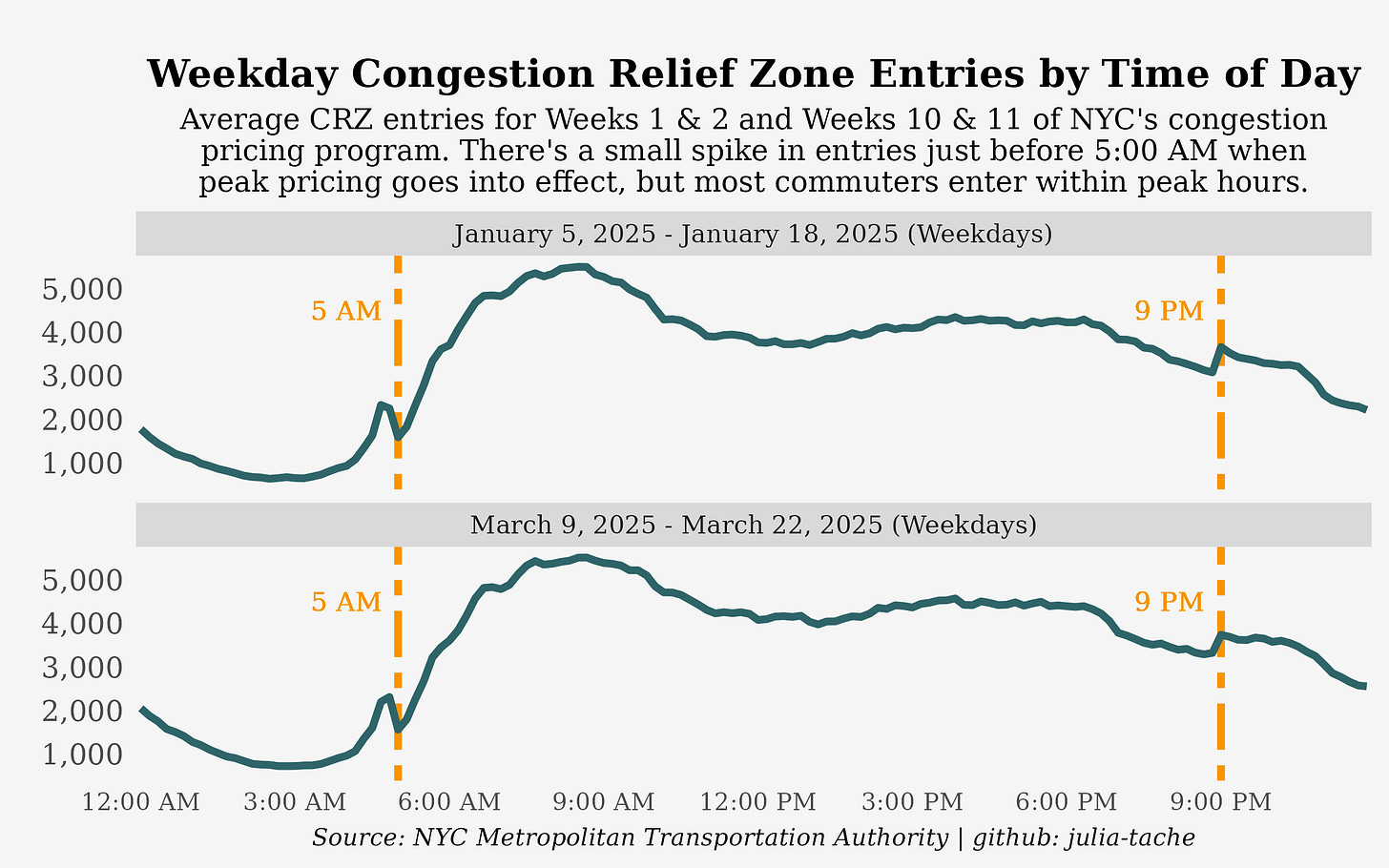 There is some evidence that certain commuters and commercial drivers are purposefully entering the CRZ just before and after peak pricing goes into effect at 5:00 AM and 9:00 PM on weekdays, as shown in the graph above. However, most drivers enter within peak hours, and there does not seem to be any indication that more drivers have been trying to enter the zone earlier over time. 95% of revenue is collected during peak hours.