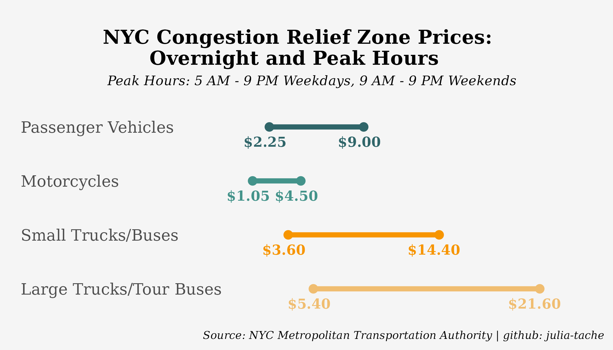 The program is structured by charging drivers entering the central business district, otherwise known as the “Congestion Relief Zone” (CRZ), based on vehicle type and hour of entry. At peak hours, which are between 5:00 AM and 9:00 PM on weekdays and 9:00 AM and 9:00 PM on weekends, car and small commercial vehicle drivers pay $9.00, motorcyclists pay $4.50, small truck and non-commuter bus drivers pay $14.40, and large truck and tour bus drivers pay $21.60. Incremental increases in the toll will take place over the course of several years.